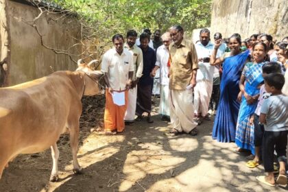 திக்குறிச்சி கோயில் செல்லும் சாலையை சீரமைக்காததை கண்டித்து கல்வெட்டுக்கு அஞ்சலி செலுத்தி பசு மாடு மற்றும் தாமிரபரணி ஆற்றுக்கு மனு கொடுத்து நூதன போராட்டம்