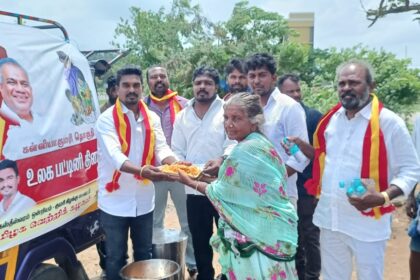 சாலையோரம் வசிக்கும் மக்களுக்கு உணவு வழங்கிய தவெக வினர்.