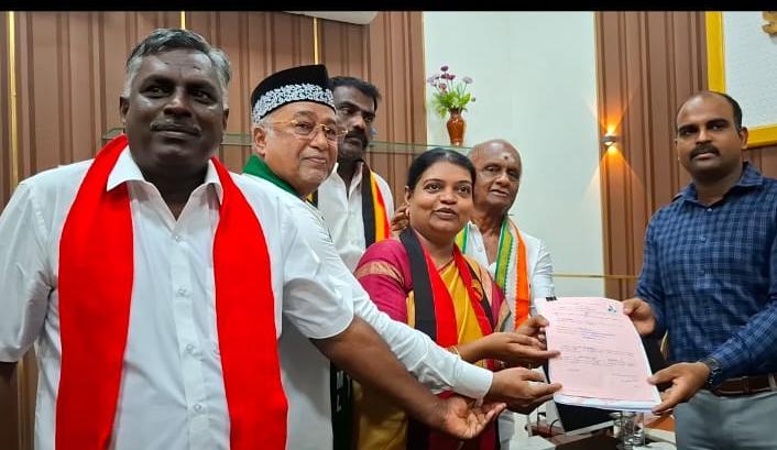 மாட்டுவண்டியில் ஏர் கலப்பையை சுமந்தவாறு தாரை தப்பட்டை அடித்து வேட்பு மனு தாக்கல் செய்ய வந்த நாம் தமிழர் கட்சி வேட்பாளர்