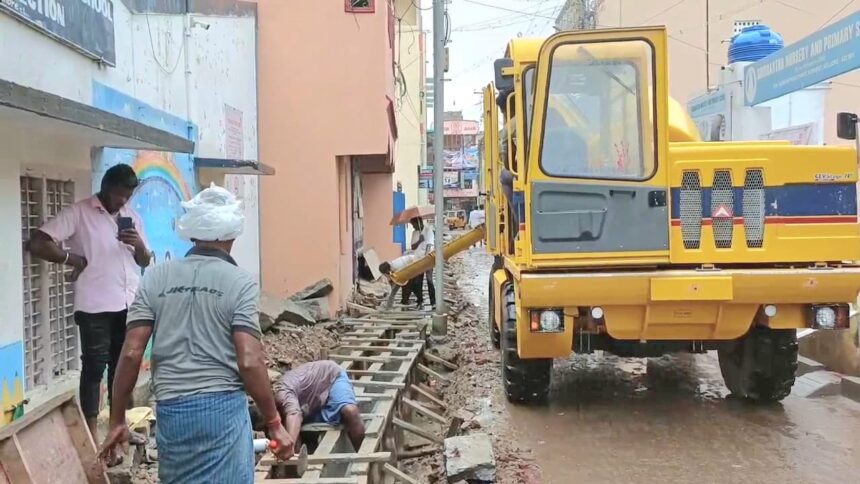 தற்போது வடகிழக்கு பருவமழை காரணமாக ஓரிரு  நாட்களுக்கு  கன மழை பெய்யும் என சென்னை வானிலை ஆய்வு மையம் தெரிவித்திருந்த நிலையில் நேற்று மாலை முதலே மிதமான மழை பெய்து வருகிறது அதனை சிறிதும்  பொறுப்பெடுத்தாமல் தண்ணீர் வரும் கால்வாய் மூடப்பட்டு கொட்டும் மழையில் கால்வாய் பணிகளை செய்து வருகின்றனர்.