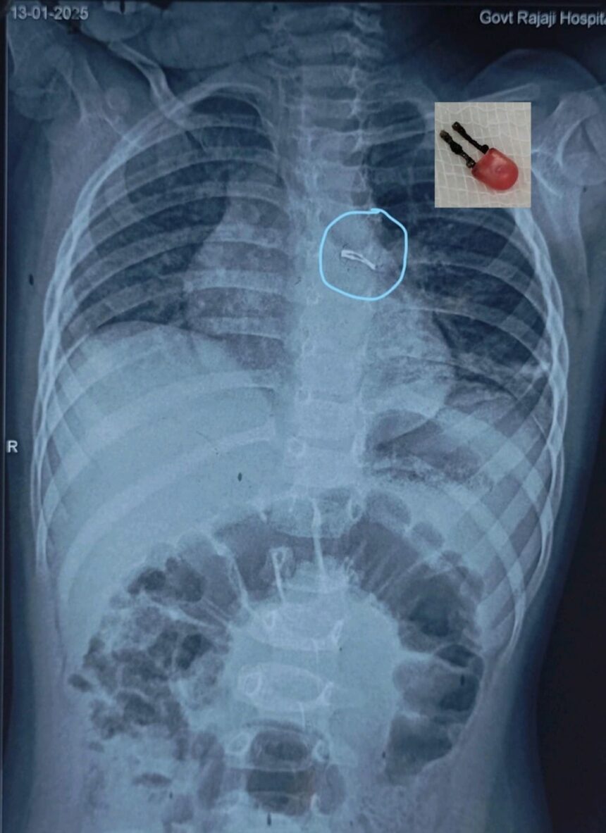 மதுரை அரசு இராசாசி மருத்துவமனையில் கடந்த 13.01.2025 அன்று ஒரு வயது பெண் குழந்தை சுமார் ஏழு நாட்களாக தொடர் இருமல் மற்றும் காய்ச்சலுக்காக உள் நோயாளியாக அனுமதிக்கப்பட்டார். அக்குழந்தையின் பெற்றோர் குழந்தை எந்த பொருளையும் விழுங்க வில்லை என்றனர். அக்குழந்தையின் எக்ஸ்ரே மற்றும் சி.டி.ஸ்கேன் பரிசோதனையில் ஊக்கு மாதிரியான புறப்பொருள் (Foreign Body) மூச்சுக் குழாயின் இடது புறத்தில் கண்டறியப்பட்டது. அரசு இராசாசி மருத்துவமனையின் மயக்க வியல் துறை இயக்குநர் பேராசிரியர். மரு.கல்யாணசுந்தரம் தலைமையிலான மயக்க வியல் மருத்துவ குழு மற்றும் நெஞ்சக நோய் மருத்துவ துறைத் தலைவர் பேராசிரியர் மரு.பிரபாகரன் மற்றும் குழந்தைகள் அறுவை சிகிச்சை துறைத் தலைவர் பேராசிரியர் மரு.மீனாட்சி சுந்தரி உள்ளிட்ட மருத்துவ குழுவினர்கள் 16.01.2025 அன்று மூச்சு குழாய் உள்நோக்கி பரிசோதனை கருவி கொண்டு பரிசோதித்ததில் LED ல் இருப்பது கண்டறியப்பட்டு சுமார் இரண்டு மணி நேர தீவிர முயற்சிக்குப் பின் வெற்றிகரமாக நீக்கப்பட்டது. இந்த சிகிச்சைக்குப் பிந்தைய தீவிர மருத்துவ கண்காணிப்பில் குழந்தையின் உடல்நிலை சீராக உள்ளது