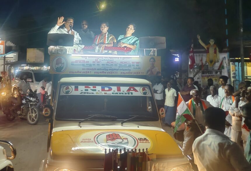 மயிலாடுதுறை மக்களவைத் தொகுதி தேர்தலில் வாக்களித்த வாக்காளர்களுக்கு மங்கைநல்லூர் பகுதியில் திமுக பொறுப்பாளர்களுடன் திறந்த வாகனத்தில் சென்று காங்கிரஸ் எம்.பி சுதா நன்றி தெரிவித்தார்.