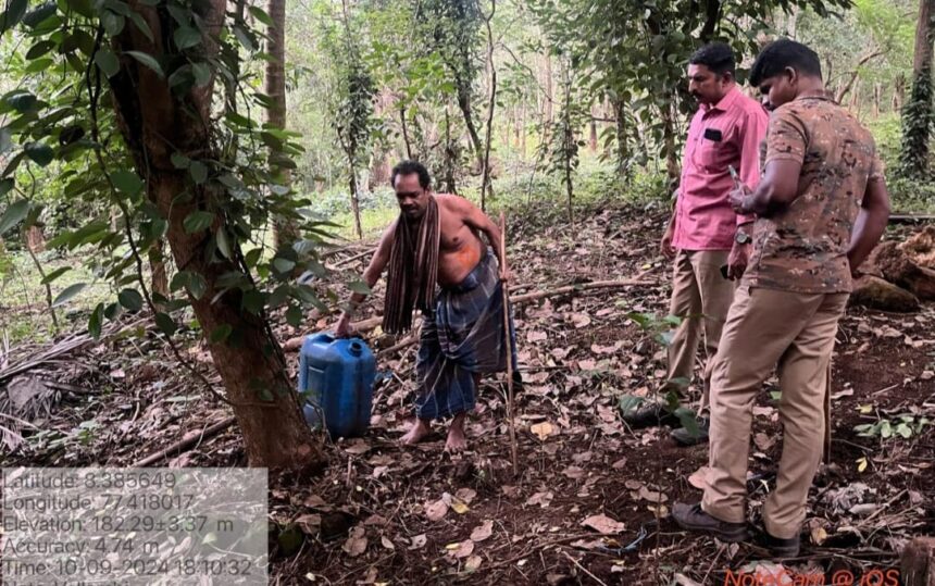 குமரி மாவட்டம் கீரிப்பாறையை அடுத்துள்ள வெள்ளாம்பி மலை பகுதியில் சாராயம் காய்ச்சுவதாக அழகிய பாண்டியபுரம் வனச்சரக அலுவலகத்திற்க்கு வந்த ரகசிய தகவலின் அடிப்படையில் அழகிய பாண்டியபுரம் வனச்சரகர் கலையரசன் வனத்துறையினருடம் சம்பந்தபட்ட இடத்திற்க்கு சென்று சோதனை செய்தார்.அதில் வெள்ளாம்பி பகுதியை சேர்ந்த ராமர் கானி (49) என்பவரது வீட்டின் பின்புறம் உள்ள தோட்டத்தில் சாராயம் காய்ச்சுவதற்க்கான பொருட்கள் மற்றும் ஊரல்களும் ஒரு தள்ளுவண்டியினுடைய அடியில் ஒளித்து வைத்திருப்பதை கண்டு அதிர்ச்சியடைந்தனர். பின்னர் இது குறித்து மாவட்ட வன அலுவலர் பிரசாந்த் உத்தரவின் பேரில் ராமர் காணிக்கு இருபத்தைந்தாயிரம் ரூபாய்அபராதமும் இனி சாராயம் காய்ச்ச மாட்டேன் என்று மன்னிப்பு கடிதமும் வாங்கி வனத்துறையினர்எச்சரித்து அனுப்பினர்.