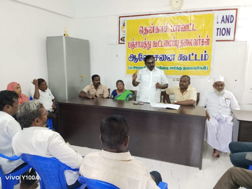 தென்காசியில் 9 மாவட்ட ஊராட்சி மன்ற தலைவர்கள் கூட்டமைப்பின் ஆலோசனை கூட்டம் நடைபெற்றது. கூட்டத்திற்கு கூட்டமைப்பு தலைவர் டி. கே.பாண்டியன் தலைமை வகித்தார், மாவட்ட பொதுச் செயலாளர் செய்யது இப்ராஹிம் வரவேற்புரை ஆற்றினார், மாவட்ட துணை தலைவர் அன்பு ராணி, சங்கரன்கோவில் ஊராட்சி மன்ற கூட்டமைப்பு தலைவர் வேல்சாமி பாண்டியன், மாவட்ட பொருளாளர் ராஜ்குமார், தென்காசி மாவட்ட கூட்டமைப்பு ஒருங்கிணைப்பாளர் வேல்சாமி ஆகியோர் முன்னிலை வகித்தனர். கூட்டத்தில் 9 மாவட்ட ஊராட்சி மன்ற தலைவர்களின் பதவிக்காலம் 2026 அக்டோபர் மாதம் வரை உள்ளதாக முதலமைச்சர் அறிவிக்க வேண்டும், ஊராட்சிகளில் நிதி இல்லாத ஊராட்சிகளுக்கு மக்களின் தேவைகளை பூர்த்தி செய்ய ரூ.5 லட்சம் வரை வரவு வைக்க வேண்டும் என்பன போன்ற தீர்மானங்கள் நிறைவேற்றப்பட்டது. கூட்டத்தில் ஊராட்சி மன்ற தலைவர்களான குறும்பலாபேரி முத்துமாலையம்மாள், வயலி கருணாநிதி, கீழக்கடையம் பூமிநாத், பொட்டல்புதூர் கணேசன், கிளாங்காடு சந்திரசேகரன், வல்லம் ஜமீன் பாத்திமா, மத்தளம் பாறை மைதிலி, தெற்கு கடையம் முத்துலட்சுமி, கற்குடி முத்துப்பாண்டியன் உள்ளிட்டோர் கலந்து கொண்டனர்.