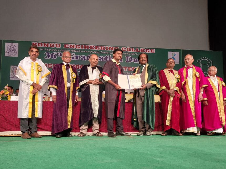 பெருந்துறை கொங்கு என் ஜினீயரிங் கல்லூரியில் 36-வது பட்டமளிப்பு விழா கொங்கு வேளாளர் தொழில்நுட்ப கல்வி அறக்கட்டளை தலை வர் டாக்டர் ஆர்.குமாரசாமி தலைமையில் நடைபெற்றது. தாளாளர் ஏ.கே இளங்கோ முன்னிலை வகித்தார். முதல்வர் பாலுசாமி வரவேற்றார்.