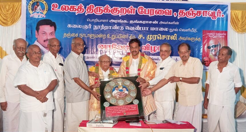 தஞ்சாவூர் பெசன்ட் அரங்கில் உலக திருக்குறள் பேரவை சார்பில் பொறியாளர் அரங்க தங்கராசன் எழுதிய கலைஞர் நூற்றாண்டு வெண்பா மாலை நூல் வெளியீட்டு விழா, மக்களவை உறுப்பினர் ச.முரசொலிக்குவரவேற்பு விழா சிறப்பாக நடைபெற்றது.