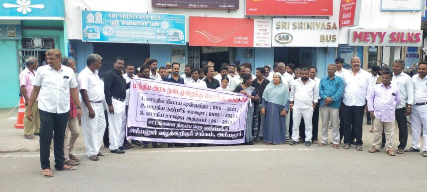 மத்திய அரசு கொண்டுவந்துள்ள 3 புதிய குற்றவியல் சட்டங்களை திரும்பப் பெற வலியுறுத்தி ஜூலை 1 முதல் 6 வரை நீதிமன்றப் பணிகளைப் புறக்கணித்து அரியலூர் வழக்கறிஞர்கள் சங்கத்தினர் தொடர் போராட்டத்தில் ஈடுபட்டு வருகின்றனர். அதன்படி 2 ஆவது நாளான செவ்வாய்க்கிழமை  திருச்சி சாலையிலுள்ள அஞ்சல் நிலையத்தை முற்றுக்கையிட்டு ஆர்ப்பாட்டத்தில் ஈடுபட்டனர்.