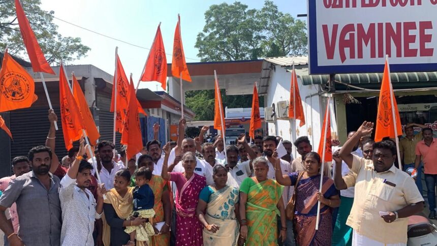 தமிழகம் முழுவதும் இந்து இயக்க பொறுப்பாளர்களை கைது செய்ததையும், திருப்பரங்குன்றத்திற்கு 144 தடை உத்தரவு போட்டு இருப்பதையும் கண்டித்து ஈரோடு மூலப் பாளையத்தில் இந்து முன்னணி மாவட்ட தலைவர் ஜெகதீசன் தலைமையில் மாவட்ட பொதுச் செயலாளர் கார்த்தி முன்னிலையில் ஆர்ப்பாட்டம் நடைபெற்றது.