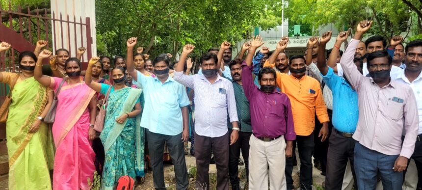 பட விளக்கம் பரமக்குடி அரசு கலை கல்லூரியில் நீதிமன்ற உத்தரவின்படி சம்பளம் வழங்க வேண்டும் எனக் கூறி கௌரவ விரிவுரையாளர்கள் வாயில் துணியை கட்டிக் கொண்டு நூதன முறையில் போராட்டத்தில் ஈடுபட்டனர்