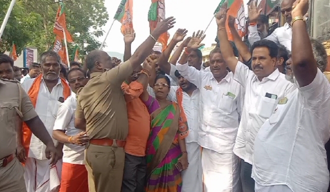 100க்கும் மேற்பட்ட பாஜகவினரை போலீசார் கைது செய்து பேருந்து மூலம் அழைத்து சென்று தனியார் திருமண திருமண மண்டபத்தில் அடைத்தனர்.