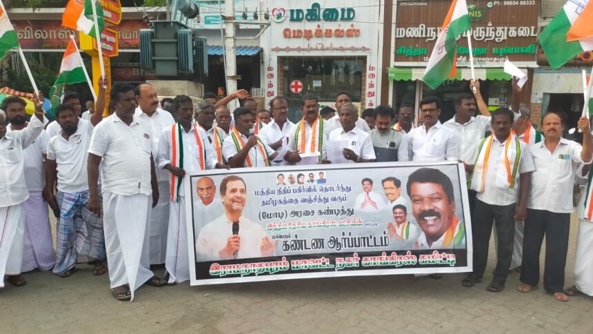 மத்திய அரசு நிதியை பாரபட்சமாக ஒரு சில மாநிலங்களுக்கு மட்டும் வழங்கி தமிழ்நாட்டை தொடர்ந்து வஞ்சிக்கின்ற மத்திய பிஜேபி அரசை கண்டித்து, தமிழ்நாடு காங்கிரஸ் கமிட்டி தலைவர் செல்வப்பெருந்தகை  அறிவுறுத்தலுக்கிணங்க, ராமநாதபுரம் மாவட்ட காங்கிரஸ் கமிட்டியின் சார்பில், மாநில பொதுக்குழு உறுப்பினர் சோ. பா. ரங்கநாதன் தலைமையிலும்  மாவட்ட பொறுப்பு குழு உறுப்பினர்கள் ராஜாராம் பாண்டியன், ஜோதி பாலன், சரவண காந்தி, நகர் தலைவர் கோபி ஆகியோர் முன்னிலையிலும்   ராமநாதபுரம் அரண்மனை அருகில் மாபெரும் கண்டன ஆர்ப்பாட்டம் நடைபெற்றது.