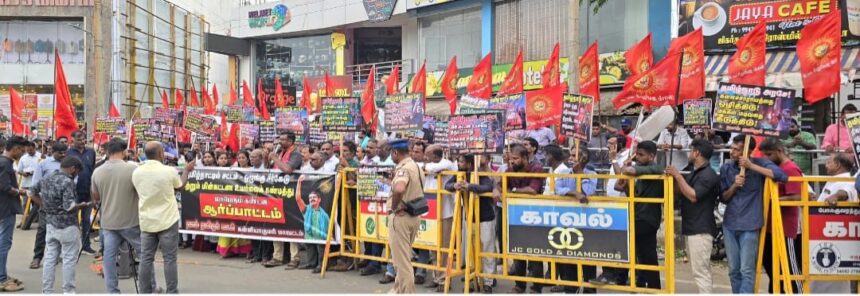 தமிழ்நாட்டில் தொடர்ச்சியாக அதிகரித்துவரும் கொலை, கொள்ளை, கள்ளச்சாராய விற்பனை, போதைப் பொருட்களின் புழக்கம், பாலியல் வன்கொடுமைகள், சாதிய மோதல்கள், வன்முறைத் தாக்குதல்கள், ரெளடிகளின் அட்டூழியம், கூலிப்படை கலாச்சாரம், கருத்துரிமைக்கு எதிரான அரசின் அடக்குமுறைகள் ஆகியவற்றால் முற்றுமுழுதாகச் சீரழிந்து போயுள்ள சட்டம்-ஒழுங்கைக் காக்கத் தவறியதைக் கண்டித்தும், திமுக ஆட்சிக்கு வந்த 3 ஆண்டுகளில் மூன்றாவது முறையாக மின்கட்டணத்தை உயர்த்தி, அனைத்துத் தரப்பு மக்களையும் கடுமையான பாதிப்புக்கு உள்ளாக்கியுள்ளதைக் கண்டித்தும் நாம் தமிழர் கட்சி கன்னியாகுமரி மாவட்ட சார்பாக நேற்று மாலை மாவட்ட ஆட்சியர் அலுவலகம் எதிரே மாபெரும் கண்டன ஆர்ப்பாட்டம் நடைபெற்றது. இதில் மாநில ஒருங்கிணைப்பாளர் ஜஸ்டின் பெனடிகட் ராஜ் முன்னிலை வகித்தார்