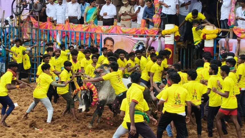 தருமபுரி அடுத்த தடங்கம் ஸ்ரீ மண்டு மாரியம்மன் கோயில் திருவிழா ஆண்டுதோறும் சிறப்பாக நடைபெற்று வருகிறது. இத்திருவிழாவை முன்னிட்டு 3 ம் ஆண்டு PR பேரவை சார்பில் மாபெரும் ஜல்லிக்கட்டு போட்டியினை மாவட்ட ஆட்சி தலைவர் சதீஷ் மற்றும் காவல் கண்காணிப்பாளர் மகேஸ்வரன் ஆகியோர் தொடங்கி வைத்தனர்.