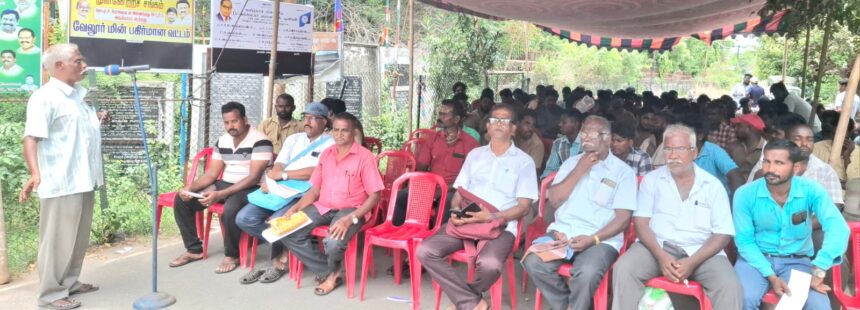 வேலூர் மாவட்டம் ,தமிழக முதல்வரின் தேர்தல்கால வாக்குறுதியினை நிறைவேற்றிடக் கோரியும் தமிழ்நாடு மின் ஊழியர் மத்திய அமைப்பு சார்பில் மின்வாரியத்தில் பணிபுரிந்து வரும் ஒப்பந்த ஊழியர்களை அடையாளம் கண்டு நிரந்தரப்படுத்தக் கோரியும் மாநிலம் தழுவிய தர்ணா போராட்டம் வேலூர் காந்திநகர் மேற்பார்வை பொறியாளர் அலுவலகம் அருகில் எஸ். சாம்ராஜ் ,ஜே. விமல் பாண்டியன், ஆகியோர் தலைமையில் நடைபெற்றது. வேலூர் திருப்பத்தூர் மாவட்ட செயலாளர் சிஐடியு எஸ். பரசுராமன் துவக்க உரையாற்றினார். உடன் வேலூர் திட்ட செயலாளர் டி. ஜெகன் ,திட்ட பொருளாளர் எம். சின்னதுரை ,மாவட்ட செயலாளர் தாமோதரன், மாநில துணைத்தலைவர் எஸ். ஜோதி மற்றும் பலர் கலந்து கொண்டனர்.