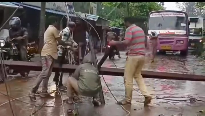 இதனால் அந்த வழியாக வந்த அரசு பஸ்கள் உள்ளிட்ட அனைத்து வாகனங்கள் போக்குவரத்து தடைபட்டது. இதையடுத்து சம்பந்தப்பட்ட மின்வாரிய துறை ஊழியர்கள் விரைந்து வந்து அந்தப் பகுதியில் முறிந்த மின் கம்பத்தை சுமார் 2 மணி நேர போராட்டத்திற்கு பின்பு அகற்றினர். அதன்பிறகு போக்குவரத்து சரி செய்யப்பட்டது.