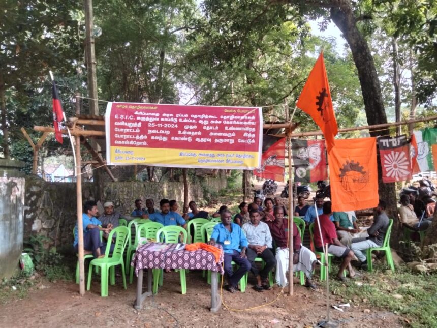 மத்திய அரசு திட்டமான தொழிலாளர் காப்பீடு திட்டமான இஎஸ்ஐ மருத்துவ திட்டத்தை அரசு ரப்பர் கழகத்தில் பணி புரியும் தொழிலாளிகளுக்கு வழங்கிட கேட்டு நீண்ட நாள் கோரிக்கையாக வைத்த பிறகும் தொழிலாளிகள் நலனில் அக்கறை காட்டாமல், இ எஸ் ஐ எனும் மருத்துவ திட்டத்தை தொழிலாளர்களுக்கு வழங்காமல் தொழிலாளர்களுக்கு எதிராக செயல்படும் அரசு ரப்பர் கழக அதிகாரிகள் மீது உரிய விசாரணை செய்து நடவடிக்கை எடுக்க கோரி 25-ம் தேதி ஒரு நாள் அடையாள வேலை நிறுத்தத்துடன் உண்ணாவிரத போராட்டம் நடத்தினோம், அதனை தொடர்ந்து 26 ஆம் தேதி முதல் கோரிக்கை நிறைவேறும் வரை தினந்தோறும் இரண்டு பேர் வீதம் தொடர் உண்ணாவிரத போராட்டத்தில் ஈடுபட்டு வருகிறோம். ஆனால் இந்த உண்ணாவிரத போராட்டமானது நான்கு நாட்களாக தொடர் உண்ணாவிரத போராட்டமாக நடைபெற்றும் மாவட்ட நிர்வாகம் தரப்பிலோ, அரசு ரப்பர் கழக நிர்வாகம் தரப்பிலோ இதுவரை பேச்சுவார்த்தை நடத்தப்படாமல் காலம் தாழ்த்தி வருகிறது. இதை பார்க்கும் போது தொழிலாளிகள் நிர்வாகத்தால் தொடர்ந்து நசுக்கப்படுவதாகவே தெரிகிறது. எனவே எங்களுடைய உண்ணாவிரத போராட்டத்தை தீவிரப்படுத்தி தினந்தோறும் பத்துக்கும் மேற்பட்ட நபர்கள் கலந்து கொண்டு   உண்ணாவிரத போராட்டம் நடத்த இருக்கிறோம். சாதாரணமாக அரசு தொழிலாளிகளுக்காக வழங்கி வரும் அடிப்படை தேவையான இ எஸ் ஐ மருத்துவ காப்பீட்டை அரசு ரப்பர் கழகத்தில் பணி புரியும் தொழிலாளிகளுக்கு மட்டும் வழங்க மறுக்கும் காரணம் மர்மமாக உள்ளது.