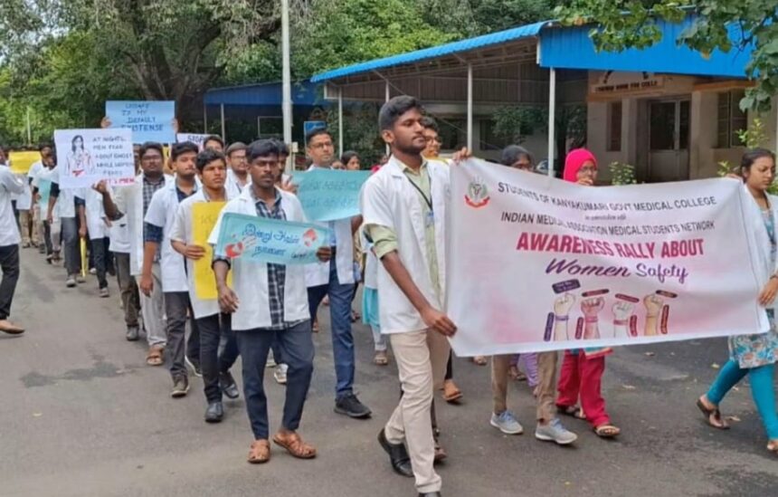 மேற்கு வங்கத்தில் பெண் மருத்துவர் பாலியல் வன்கொடுமை செய்யப்பட்டு கொலை செய்யப்பட்ட சம்பவம் பெரும் அதிர்ச்சியை ஏற்படுத்தியது. இந்நிலையில், இந்த கொலையை கண்டித்தும் பெண்களுக்கு இச்சமூகம் பாதுகாப்பு வழங்க வேண்டும் என்பதை வலியுறுத்தியும் கன்னியாகுமரி மாவட்டம் ஆசாரிப்பள்ளம் அரசு மருத்துவக் கல்லூரியில் பயின்று வரும் மாணவ மாணவியர் மருத்துவ கல்லூரியில் இருந்து ஆனந்தம் பாலம் சந்திப்பு வரை பேரணியில் ஈடுபட்டனர். இதில் தங்கள் கோரிக்கைகளை பதாகைகளில் ஏந்திய வண்ணம் நூற்றுக்கும் மேற்பட்ட மாணவிகள் உட்பட ஏராளமான மாணவர்கள் பங்கேற்றனர்.