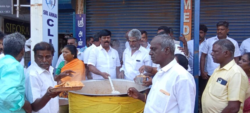 மேற்கு வட்ட கழக செயலாளர் ராஜேந்திரன் தலைமையில் சுமார் ஆயிரத்துக்கும் மேற்பட்ட பொதுமக்களுக்கு அன்னதானம் வழங்கப்பட்டது.இதில் பகுதி செயலாளர் டி சி. கருணா மற்றும் அவைத் தலைவர் ஆறுமுகம் இணைச் செயலாளர் சந்திரா துணைச் செயலாளர் துளசி ஹரி கே .சிவகுமார் ,வெல்டிங் வேலு ,கருணா, ராகவன், பாஸ்கர், நகுலன் மற்றும் கழக நிர்வாகிகள் பலர் கலந்து கொண்டனர்.