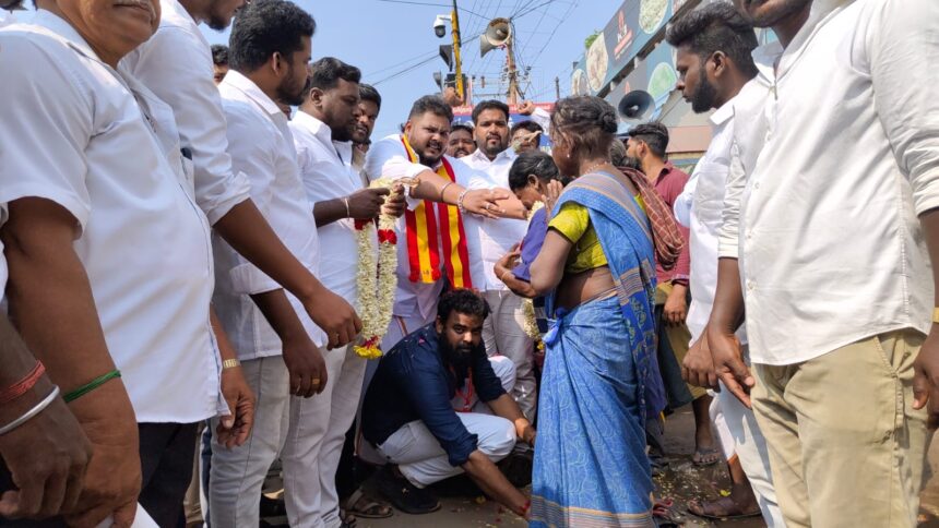 முன்னதாக மயிலாடுதுறை கிட்டப்பா அங்காடி முன்பு நகராட்சி தூய்மை பணியாளர்களுக்கு மாவட்ட இளைஞரணி தலைவர் ராஜ்குமார், மாவட்ட செயலாளர் அமீன், ஆகியோர் மாலை அணிவித்து, பாதபூஜை செய்த தமிழக வெற்றி கழகத்தினர் அங்கிருந்து ஆரவாரத்துடன் ஊர்வலமாக புறப்பட்டு சென்றனர். 2026 இல் வெற்றி பெற்று தமிழகத்தை நடிகர் விஜய் சுத்தம் செய்ய உள்ளதாகவும் கட்சியினர் தெரிவித்தனர்.