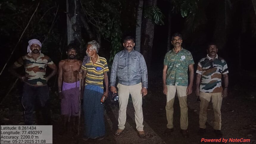 தின தமிழ் > மாவட்டம் > கனஂனியாகுமரி > பூதப்பாண்டி வனப்பகுதியில் யானைகள் விரட்டும் பணியில் ஈடுபட்ட வனத்துறையினர்