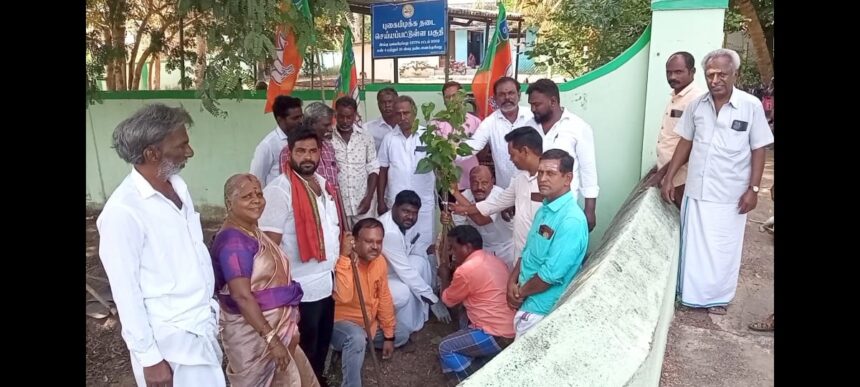பாஜக ஸ்தாபன தினத்தை முன்னிட்டு உத்திரமேரூர் அருகே அரசு மருத்துவமனையை சுத்தம் செய்து, மர கன்றுகள் நட்ட பாஜகவினர்.