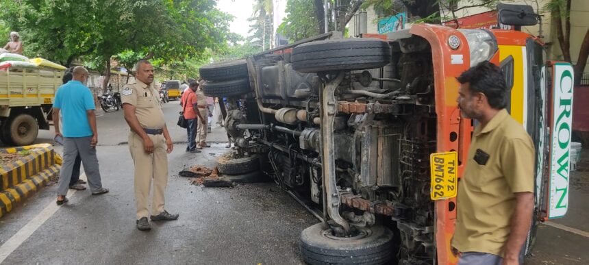 நாகர்கோவில் நகரின் முக்கிய பகுதியான டதி பெண்கள் மேல் நிலை பள்ளி சந்திப்பில் பெயிண்ட் ஏற்றி வந்த கனரக வாகனம் இந்த சாலையில் வந்த போது புத்தம் புது சாலையில் வாகனத்தின் சக்ரம் மன்னில் புதைந்து பள்ளம் ஏற்ப்பட்டு வாகனம் கவிழ்ந்து அருகில் நின்ற ஆட்டோவும் முற்றிலும் சேதம் அடைந்தது அப்பளம் போல் நொருங்கியது. இச்சம்பவம் பள்ளி குழந்தைகள் தங்கள் பள்ளிகளுக்கு செல்லும் வேளையான ஒன்பது மணிக்கு நடந்திருந்தால் நிச்சயமாக உயிர்பலி ஏற்பட்டிருக்க வாய்ப்பு உண்டு எனவும் அதற்கு ஆதாரமாக லாரி கவிழ்ந்த போது அருகில் நின்ற ஆட்டோ ஒன்று அப்பளம் போல் நொறுங்கி கிடப்பதையும் காண்பித்த பொதுமக்கள் தரமற்ற மாநகராட்சி பணியே இந்த விபத்துக்க காரணம் என தெரிவித்தனர்.