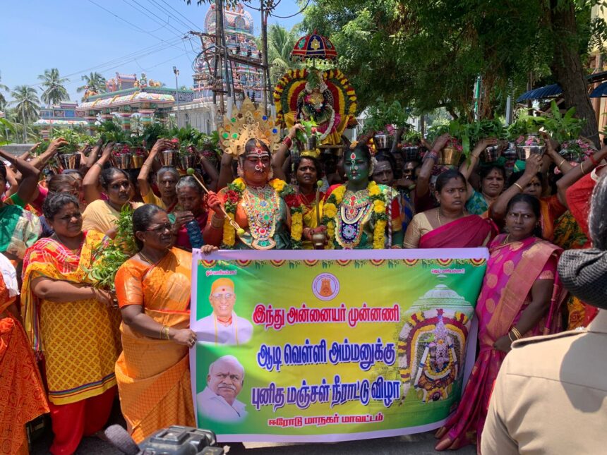 ஈரோடு மாநகர் மாவட்டம் இந்து அன்னையர் முன்னணி சார்பாக ஆடி வெள்ளியை யொட்டி ஈரோடு காரை வாய்க்கால் சின்ன மாரியம்மனுக்கு புனித மஞ்சள் நீராட்டு விழா நடந்தது.