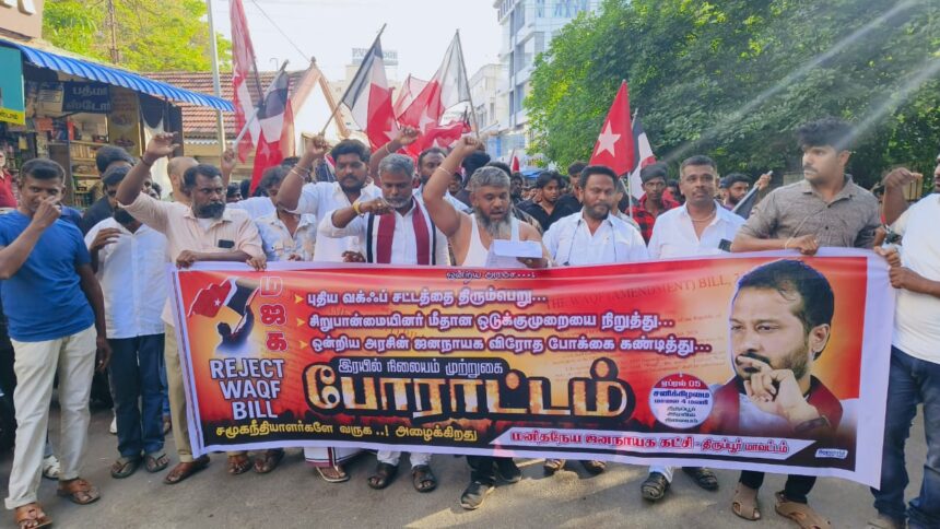 புதிய வக்ஃப் சட்டத்தை திரும்ப பெற குறையும் சிறுபான்மையினர் மீதான ஒடுக்கு முறையை நிறுத்த குறையும் மத்திய அரசின் ஜனநாயக விரோத போக்கை கண்டித்தும் மனிதநேய ஜனநாயக கட்சி சார்பில் ரயில் நிலையம் முற்றுகை போராட்டம் மாவட்ட செயலாளர் ராயல் ராஜா தலைமையில் ரயில் நிலையம் முற்றுகை நடைபெற்றது. இதில் தொழிற்சங்க மாநில துணைச் செயலாளர் ஜாகிர் உசேன் சமூக நீதி பாசறை மாநில செயலாளர் நெல்லை ரமேஷ் மனித உரிமை அணி மாநில செயலாளர் திருப்பூர் கண்ணன் கட்சியின் மாவட்ட நிர்வாகிகள் மற்றும் மாவட்ட இளைஞரணி செயலாளர் நௌபில் உள்ளிட்ட நிர்வாகிகள் 100 மேற்பட்டோர் கலந்து கொண்டனர்.
