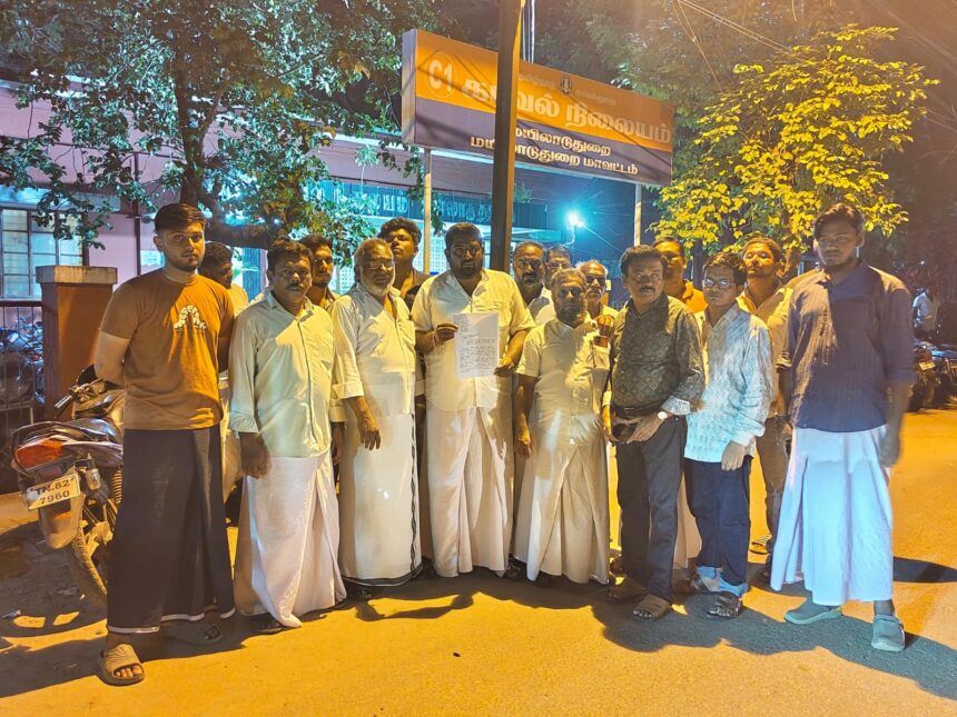 மயிலாடுதுறையில் முஸ்லீம்களையும், இஸ்லாமியர் மார்க்கத்தையும் தவறாக சித்தரித்து கருத்துகளை வாட்ஸ்அப் குருப்பில் தனிநபர் பரப்பி வருவதாக குற்றம்சாட்டி நடவடிக்கை எடுக்க கோரி மனிதநேய மக்கள் கட்சியின் மாவட்ட செயலாளர் பி.எம்.பாசித் தலைமையில் மயிலாடுதுறை காவல் நிலையத்தில் இஸ்லாமியர்கள்