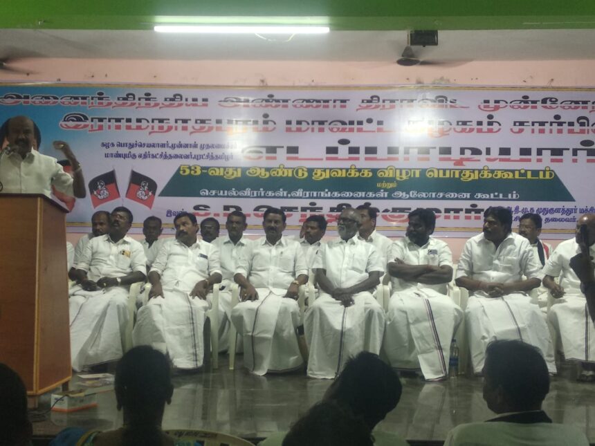 இராமநாதபுரம் மாவட்டம் முதுகுளத்தூர் மத்திய ஒன்றிய கழக செயல்வீரர்கள் ஆலோசனை மற்றும் 53-ம் ஆண்டு தொடக்க விழா பொதுக்கூட்டம் யாதவர் திருமண மஹாலில் ஒன்றியச் செயலாளரும் வெங்களகுறிச்சி ஊராட்சி மன்றத் தலைவருமான எஸ்.டி.செந்தில் குமார். தலைமையில் ஒன்றிய செயலாளர்கள் கடலாடி முனியசாமிபாண்டியன் எஸ்.பி.