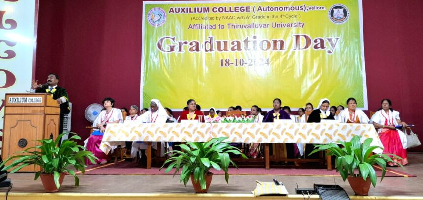 வேலூர் மாவட்டம், வேலூர் காட்பாடி காந்திநகர் அக்சிலியம் கல்லூரியில் 65 வது பட்டமளிப்பு விழா பள்ளி கலையரங்கில் நடைபெற்றது இதில் சிறப்பு விருந்தினர் தமிழ்நாடு மாநில அறிவியல் மற்றும் தொழில்நுட்ப குழும செயலர் பேரா. முனைவர் எஸ். வின்சென்ட் கலந்து கொண்டு சிறப்புரையாற்றினார் முனைவர் மேரி ஜோஸ்பின் ராணி கல்லூரி செயலர் முன்னிலை வகித்தார். முனைவர் ஆரோக்கிய ஜெயசீலி கல்லூரியின் முதல்வர் வரவேற்புரையாற்றினார். முனைவர் வின்சி .சே தேர்வாணையர் மற்றும் இயற்பியல் துறை தலைவர் முனைவர் அமலா வளர்மதி துணை முதல்வர் ஆகியோர் கலந்து கொண்டனர் சிறப்பு விருந்தினர் பேராசிரியர் முனைவர் வின்சென்ட் 887 இளங்கலை மாணவியர்கள் 273 முதுகலை மாணவியர்கள் என மொத்தம் 1150 மாணவியர்களுக்கு பட்டமளித்தார். உதவி பேராசிரியர் கணிதத்துறை முனைவர் சபர்மதி நன்றி உரையாற்றினார்.
