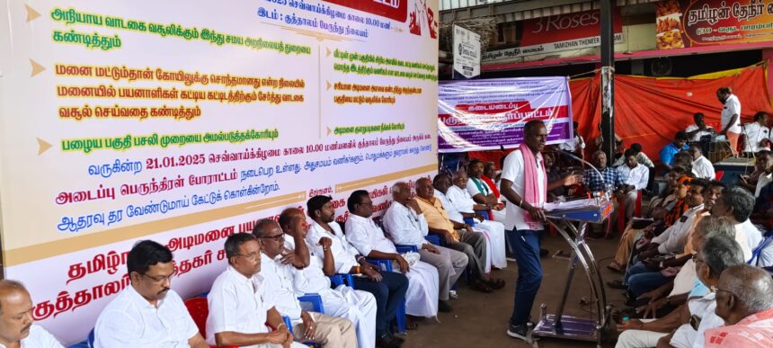 கோயில் மனைகளில் குடியிருப்போர், சிறு வணிகம் செய்வோர், விவசாய நிலங்களை பயன்படுத்துவோருக்கு பல மடங்கு வாடகையை உயர்த்தி, அத்தொகையை முன் தேதியிட்டு செலுத்த நிர்பந்திக்கப்படுவதை கண்டித்து குத்தாலத்தில் வணிகர்கள் இன்று கடையடைப்பு போராட்டம் நடத்தி வருகின்றனர். குத்தாலம் சோழீஸ்வரர் கோயிலுக்கு சொந்தமான இடங்களில் இப்பகுதி மக்கள் பலர் பல தலைமுறைகளாக குடியிருந்தும், சிறு வணிகம் செய்தும் வருகின்றனர். இவர்களுக்கு அதிக வாடகை செலுத்த கட்டாயப்படுத்தப்படுவதை கண்டித்து தமிழ்நாடு அடிமனை பயனாளிகள் குத்தகை விவசாயிகள் பாதுகாப்பு சங்கம் சார்பில் சுமார் 300 க்கும் மேற்பட்ட கடைகள் அடைத்து குத்தாலம் கடைவீதியில் இந்துசமய அறநிலையத்துறையை கண்டித்தும் கண்டன ஆர்பாட்டத்தில் ஈடுபட்டனர். மாவட்ட தலைவர் ராயர் தலைமையில் நடைபெற்ற இந்த ஆர்ப்பாட்டத்தில் மாநில தலைவர் செல்வம், மாநில பொருளாளர் துரைராஜ், மாவட்ட செயலாளர் விஜய், AIKS மாவட்ட தலைவர் சிம்சன், AIKS குணசுந்தரி, மாவட்ட துணை தலைவர் தங்கப்பன், மாவட்ட இணை செயலாளர் மேகநாதன், மாவட்ட பொருளாளர் ராமலிங்கம், மாவட்ட இணை செயலாளர் விஜயா, அவையாம்பாள்புரம் குடியிருப்போர் நல சங்கம் தலைவர் கணேசன், மற்றும் பக்கிரிசாமி, மூர்த்தி, ஜீவானந்தம், விஷ்ணுகுமார், அமிர்தலிங்கம், உள்ளிட்டோர் மற்றும் பொதுமக்கள் ஏராளமானோர் ஏராளமானோர் கொண்டனர்.
