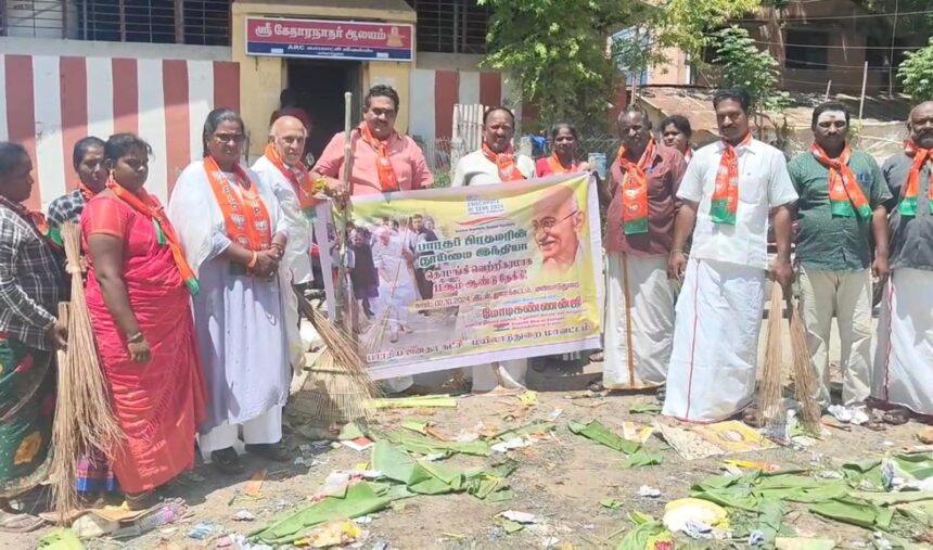 இந்தியாவில் தூய்மை பாரதம் திட்டம் தொடங்கப்பட்டு இன்றுடன் 11 ஆண்டுகள் ஆகிறது. இதனை கொண்டாடும் வகையில் மயிலாடுதுறை மாவட்டம் மயிலாடுதுறையில் தூய்மை இந்தியா திட்ட மாவட்ட ஒருங்கிணைப்பாளர் மோடி.கண்ணன் தலைமையில் பாரதிய ஜனதா கட்சியினர் கோவி சேதுராமன், நாஞ்சில் பாலு, ஸ்ரீதர், மயில்(எ)ரவி, செல்வகுமார், ஈஸ்வரன், மகளிரணி பிரியா உள்ளிட்ட ஏராளமானோர் இன்று தூய்மை பணியில் ஈடுபட்டனர். இன்று மஹாலயா அமாவாசை தினம் என்பதால் உலக புகழ்பெற்ற மயிலாடுதுறை காவிரி துலாக் கட்டத்தில் ஏராளமான பக்தர்கள் தங்கள் முன்னோர்களுக்கு தர்பணம் அளித்து விட்டு சென்ற பின்னர் அங்கு குவிந்து கிடந்த வாழை இலை மற்றும் குப்பைகளை பாஜகவினர் கூட்டிப் பெருக்கி தன்னார்வத்துடன் அகற்றினர்.