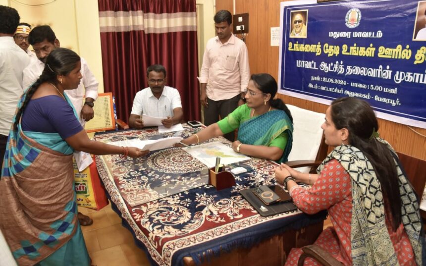 உங்களை தேடி உங்கள் ஊரில் திட்டத்தின் கீழ் வட்டாட்சியர் அலுவலகத்தில் பொதுமக்களிடம் குறைதீர்க்கும் மனுக்களை மதுரை மாவட்ட ஆட்சித்தலைவர் மா.சௌ.சங்கீதா பெற்றுக்கொண்டார். கூடுதல் ஆட்சியர் மாவட்ட ஊரக வளர்ச்சி முகமை திட்ட இயக்குநர் மோனிகா ராணா, மாவட்ட வருவாய் அலுவலர் சக்திவேல் ஆகியோர் உடன் உள்ளனர்.