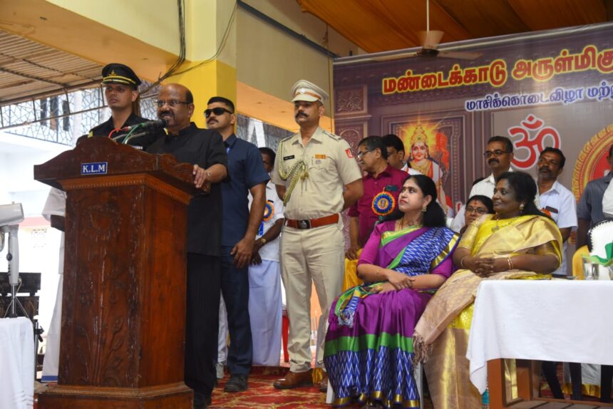 மண்டைக்காடு பகவதி அம்மன் கோவில் மாசி கொடை விழா நேற்று காலை கொடியேற்றத்துடன் தொடங்கியது. இந்து சமய மாநாடு துவக்க நிகழ்ச்சி நடைபெற்றது. இந்த நிகழ்ச்சிக்கு பாண்டிச்சேரி முன்னாள் கவர்னர் தமிழிசை சௌந்தரராஜன் குத்து விளக்கு ஏற்றி பேசினார். தொடர்ந்து மேற்கு வங்காள கவர்னர் ஆனந்த போஸ் மாநாட்டை துவக்கி வைத்து பேசினார்.