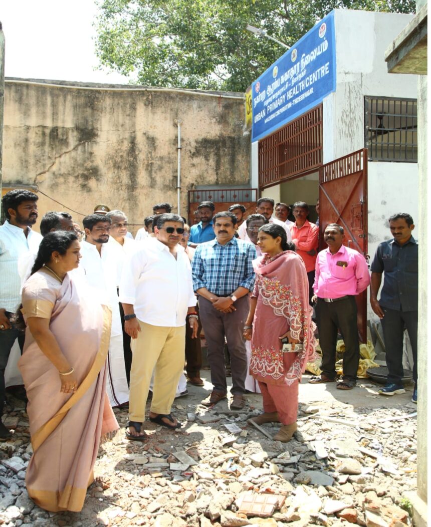 மதுரை மாநகராட்சி திடீர் நகர் நகர்ப்புற ஆரம்ப சுகாதார நிலையத்திற்கு பொதுமக்கள் மற்றும் ஆம்புலன்ஸ் எளிதாக வந்து செல்வதற்கு ஏதுவாக அருகில் உள்ள பழைய கட்டிடத்தை அகற்றுவது குறித்து தகவல் தொழில்நுட்பவியல் மற்றும் டிஜிட்டல் சேவைகள் துறை அமைச்சர் முனைவர் பழனிவேல் தியாகராஜன் ஆய்வு மேற்கொண்டார் அருகில் மாநகராட்சி மேயர் இந்திராணி பொன்வசந்த், மாநகராட்சி ஆணையாளர் சித்ரா விஜயன், தலைமை பொறியாளர் ரூபன் சுரேஷ், நகர்நல அலுவலர் மரு.இந்திரா, மாமன்ற உறுப்பினர் கார்த்திக் ஆகியோர் உடன் உள்ளனர்.
