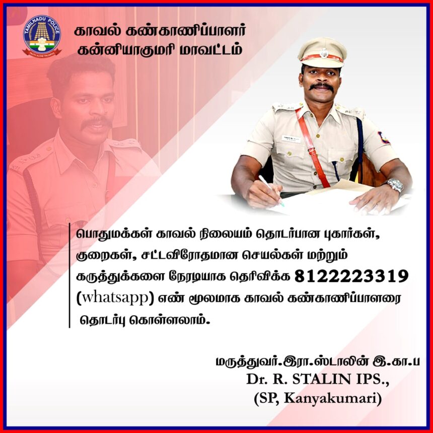 கன்னியாகுமரி மாவட்ட பொதுமக்கள், காவல் நிலையம் தொடர்பான புகார்கள், குறைகள், சட்டவிரோதமான செயல்கள் மற்றும் கருத்துக்களை நேரடியாக எஸ் பி -யிடம் தெரிவிக்க 8122223319 வாட்ஸ் அப் எண் அறிமுகப்படுத்தி இருப்பதாக மாவட்ட காவல்துறை சார்பாக நேற்று அறிவிக்கப்பட்டிருந்தது.