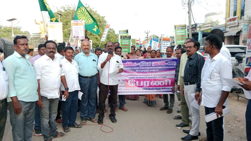 பழைய ஓய்வூதிய திட்டத்தை மீண்டும் அமல்படுத்த வேண்டும் உள்பட 10 அம்ச கோரிக்கைகளை அமல்படுத்த கோரி முன்னாள் மாவட்ட செயலாளர் சேகர் பேசினார். தமிழ்நாடு முதுகலை பட்டதாரி ஆசிரியர் சங்க மாவட்ட செயலாளர் மாரிசாமி, தமிழ்நாடு அரசு ஊழியர் சங்க முன்னாள் மாவட்ட செயலாளர்கள் ராபர்ட் ஜெயராஜ், முத்து முருகன், அங்கன்வாடி பணியாளர் சங்க மாவட்ட செயலாளர் முருகேஸ்வரி உள்பட கலந்து கொண்டனர். கோரிக்கைகளை வலியுறுத்தி கோஷங்கள் எழுப்பியவாறு பேரணி அண்ணா சிலை முன்பாக துவங்கி வண்டிக்காரர் தெரு மற்றும் முக்கிய வீதிகள் வழியாக வந்து அரண்மனையில் பேரணி நிறைவடைந்தது. அரண்மனையில் தமிழ்நாடு தொடக்கப்பள்ளி ஆசிரியர் கூட்டணி மாவட்ட செயலாளர் சிவபாலன் கோரிக்கைகளை விலக்கிப் பேசி பேரணியை நிறைவு செய்தார்.