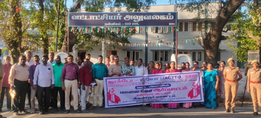 திருவாரூர் மாவட்டம் நன்னிலம் வட்டாட்சியர் அலுவலகம் முன்பு ஜாக்டோ ஜியோ அமைப்பினர் பல்வேறு அம்ச கோரிக்கைகளை வலியுறுத்தி கண்டன ஆர்ப்பாட்டத்தில் ஈடுபட்டனர் ஆர்ப்பாட்டத்தில் 1.4.2003 க்கு பிறகு அரசு பணியில் சேர்ந்தோருக்கு தற்போது நடைமுறைப்படுத்தப்பட்டு வரும் பங்களிப்புடன் கூடிய ஓய்வூதிய திட்டங்களை கைவிட்டு பழைய ஓய்வூதிய திட்டத்தினை அமல்படுத்த வேண்டும், காலவரையின்றி முடக்கி வைக்கப்பட்டுள்ள சரண் விடுப்பு ஒப்படைப்பு, உயர்கல்வி காண ஊக்க ஊதிய உயர்வு ஆகியவற்றை உடனடியாக வழங்க வேண்டும், இடைநிலை ஆசிரியர்களுக்கும் உயர்நிலைப் பள்ளி மற்றும் மேல்நிலைப்பள்ளி தலைமை ஆசிரியர்களுக்கும் முதுகலை ஆசிரியர்களுக்கும் உடற்கல்வி இயக்குனர் மற்றும் உடற்கல்வி ஆசிரியர்களுக்கும் ஒன்றிய அரசு ஆசிரியர்களுக்கு இணையான ஊதியம் வழங்கப்படாமல் வருவதை களையப்பட வேண்டும்,