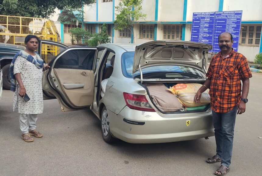 அப்போது அனந்தன்பாலம் என்ற இடத்தில் வைத்து சந்தேகத்திற்கு இடமாக சொகுசு கார் வந்து கொண்டுண்டு இருந்தது. அதனை நிறுத்தும் படி சைகை காட்டிய போதிலும் கார் நிற்காமல் சென்றதால் துரத்தி மடக்கி பிடித்தனர். அப்போது கார் ஓட்டுனர் காரை நிறுத்திவிட்டு தப்பி ஓடிவிட்டார்.