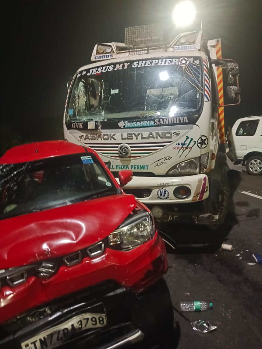மேலும் அந்த வழியாக சென்ற இரண்டு சொகுசு கார்களில் இருந்த மூன்று பேர் படுகாயம் அடைந்தனர். மேலும் கனிம வள லாரி ஒன்றில் இருந்த ஓட்டுநர் சீட்டில் நசுங்கி சிக்கிக்கொண்டார். அவரை போலீசார் மற்றும் தீயணைப்பு துறையினர் சேர்ந்து டோரை உடைத்து அரை மணி நேர போராட்டத்திற்கு பின்னர் மீட்டர் பாலம் முழுதும் போர்க்களம் போல் காட்சி அளித்தது.