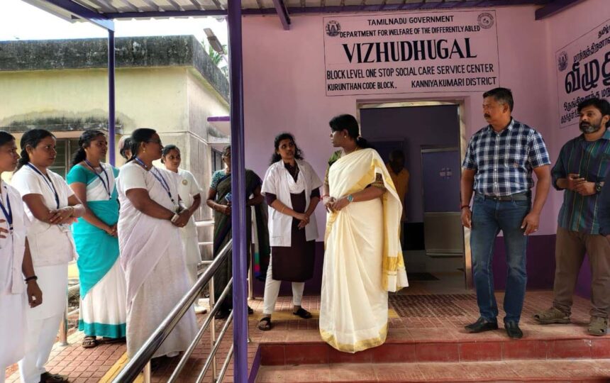 அதனடிப்படையில் குருந்தன்கோடு வட்டாரம் முட்டம் பகுதியில் ரூ.14.5 இலட்சம் மதிப்பில் புனரமைக்கப்பட்ட விழுதுகள் – ஒருங்கிணைந்த மறுவாழ்வு சேவை மையம் நேரில் பார்வையிட்டு ஆய்வு மேற்கொள்ளப்பட்டது. கன்னியாகுமரி மாவட்டத்தில் கோட்ட அளவில் 02 ஒரிடச் சேவை மையங்கள் மற்றும் வட்டார அளவில் 17 ஓரிட சேவை மையங்கள் நிறுவிட அரசு கட்டடங்கள் தேர்வு செய்யப்பட்டு பழுதுபார்த்தல் மற்றும் பராமரிப்பு பணிகள் மேற்கொள்ளப்பட்டு வருகிறது. மேற்குறிப்பிட்ட ஓரிட சேவை மையங்கள் பிப்ரவரி 2026 முதல் செயல்பாட்டிற்கு கொண்டுவரப்பட உள்ளது என கூறினார்.