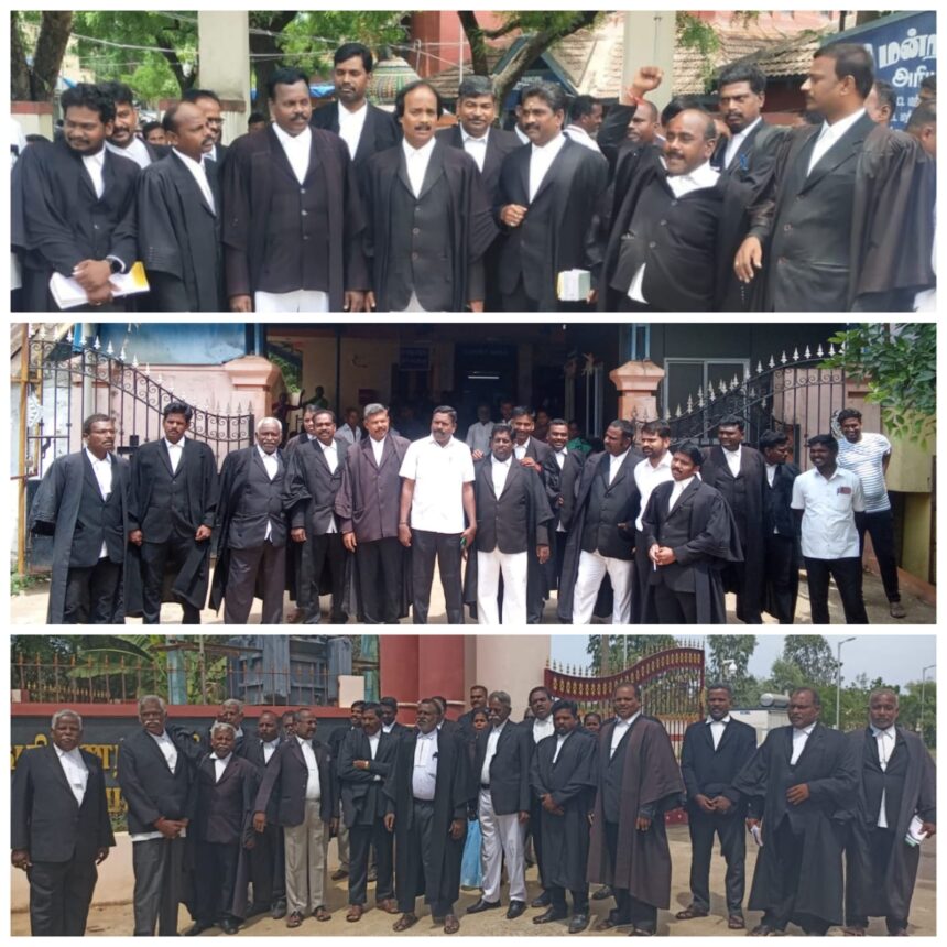 இதே போல் செந்துறை மாவட்ட குற்றவியல் மற்றும் உரிமையியல் நீதிமன்றத்தின் முன்பு வழக்கறிஞர்கள் சங்கத்தின் தலைவர் காரல் மார்க்ஸ் தலைமையில் நடைபெற்றது.