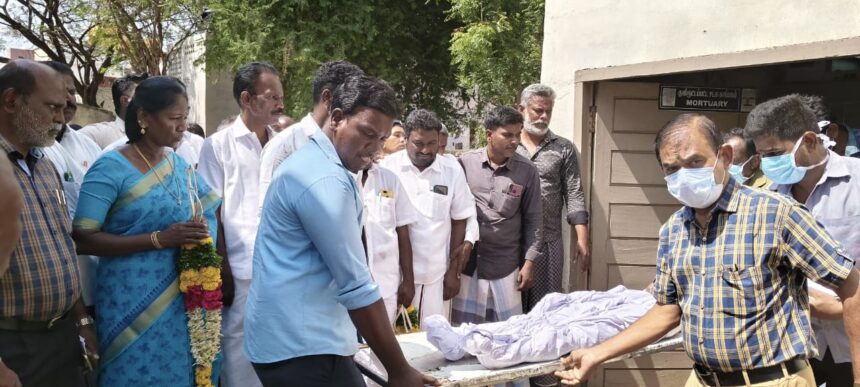 தமிழரசி ரவிக்குமார் குழந்தைகளின் உடல்களுக்கு மாலை அணிவித்து மரியாதை செலுத்தினார்.