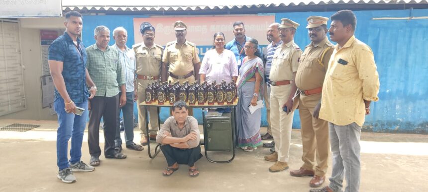 கன்னியாகுமரி மாவட்டம் நாகர்கோவில் ஜங்ஷன் ரயில் நிலையத்தில் குஜராத் மாநிலம் காந்தி தாமிலிருந்து நாகர்கோயில் ஜங்ஷன் ரயில் நிலையத்திற்கு காந்திதாம் எக்ஸ்பிரஸ் ரயில் நேற்று காலை 11.30 மணி அளவில் நடைமேடை ஒன்றில் வந்து சேர்ந்தது. இந்த ரயிலில் பேண்டிரி காரில் பணிபுரியும் குஜராத் மாநிலத்தை சேர்ந்த வனம் சிங் யாதவ் (48) என்பவர் ஒப்பந்த ஊழியராக பணியாற்றி வருகிறார். இவரது கைப்பையில் மறைத்து வைத்து குஜராத்திலிருந்து குமரி மாவட்டத்தில் விற்பனை செய்வதற்க்காக கொண்டு வரப்பட்ட 26 லிட்டர் மதுபானம் 35 மதுபாட்டில்கள் பாட்டில்களில் கொண்டு வருவதாக நாகர்கோவில் இருப்பு பாதை ரயில்வே போலீசாருக்கு கிடைத்த ரகசிய தவலின் படி வனம் சிங் யாதவின் கைபையினை ரயில்வே காவல் நிலைய ஆய்வாளர் ஜெயபால், நாகர்கோவில் மதுவிலக்கு ஆய்வாளர் பிரவினா, துணை ஆய்வாளர்கள் பாண்டியம்மாள், குருநாதன், திருவனந்தபுரம் ரயில்வே காவல் நிலைய உளவுத்துறை சிறப்பு காவல் துணை ஆய்வாளர் ஜோஸ் தலைமையிலான போலீசார் சோதனை செய்ததில் வனம் சிங் யாதவ் இடம் இருந்து 35 மது பாட்டில்கள் கைப்பற்றி விசாரணை நடத்தி வருகின்றனர்.
