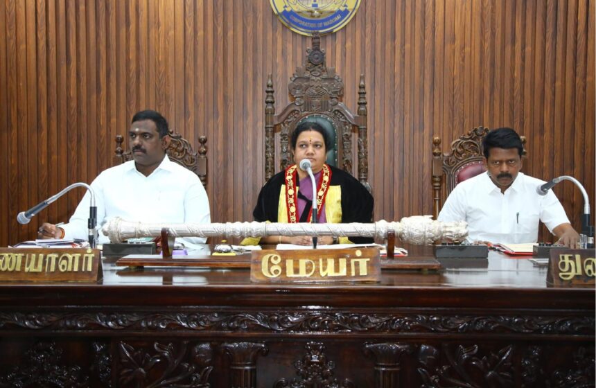 மதுரை மாநகராட்சி அறிஞர் அண்ணா மாளிகை பெரியார் அரங்கில் மாமன்றக்கூட்டம் மேயர் இந்திராணி பொன்வசந்த் தலைமையில் நடைபெற்றது அருகில் ஆணையாளர் ச.தினேஷ் குமார், துணை மேயர் தி.நாகராஜன், தெற்கு சட்டமன்ற உறுப்பினர் பூமிநாதன் மற்றும் மாமன்ற உறுப்பினர்கள் ஆகியோர் உடன் உள்ளனர்.