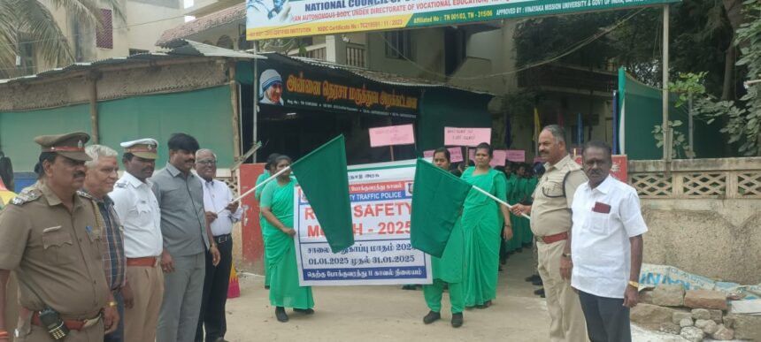 மதுரை அழகப்பன் நகரில் உள்ள அன்னை தெரசா மருத்துவ அறக்கட்டளை நிறுவனமும் மாநகரப் போக்குவரத்து காவல்துறையும் இணைந்து நடத்திய மாபெரும் சாலைப் பாதுகாப்பு விழிப்புணர்வு பேரணி.