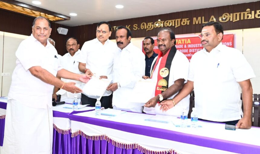 கூட்டமைப்பினர் உள்பட பல்வேறு சங்கத்தின் சார்பில் அமைச்சர் முத்துசாமியிடம் கோரிக்கை மனுக்களை கொடுத்தனர்.