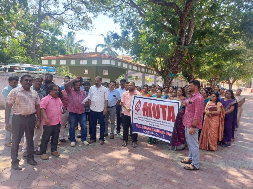 குமரி மாவட்டம் நாகர்கோவில் தெ.தி.இந்துக் கல்லூரி முன்பு மூட்டா மற்றும் ஏ யூ டி-வை சேர்ந்த பேராசிரியர்கள் இணைந்து கல்லூரி வாயில் முன்பு ஆர்ப்பாட்டத்தில் ஈடுபட்டனர்.