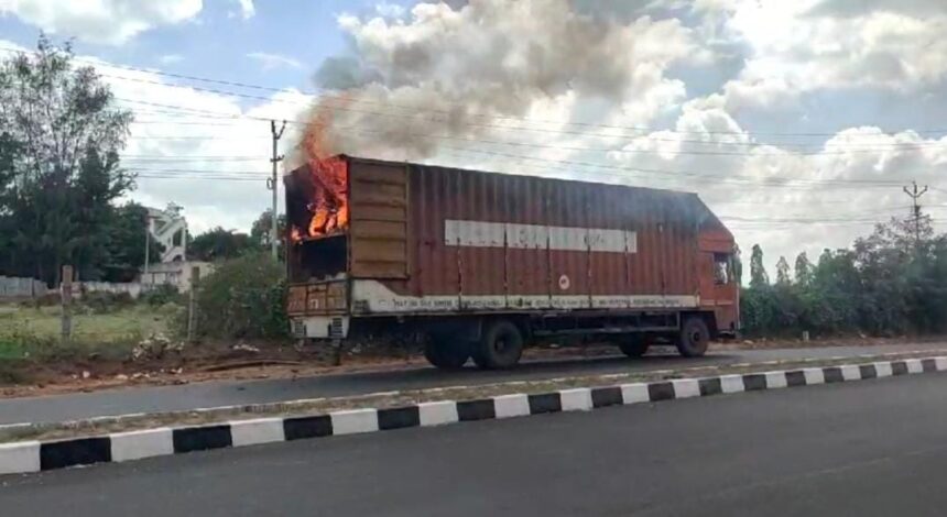 மளமளவென பரவிய தீயை தீயணைப்பு வீரர்கள் அணைத்து வருகின்றனர். கண்டெய்னர் லாரி சாலையோரமாக நிறுத்தப்பட்டதால் போக்குவரத்திற்கு எந்த இடையூறும் ஏற்ப்படவில்லை